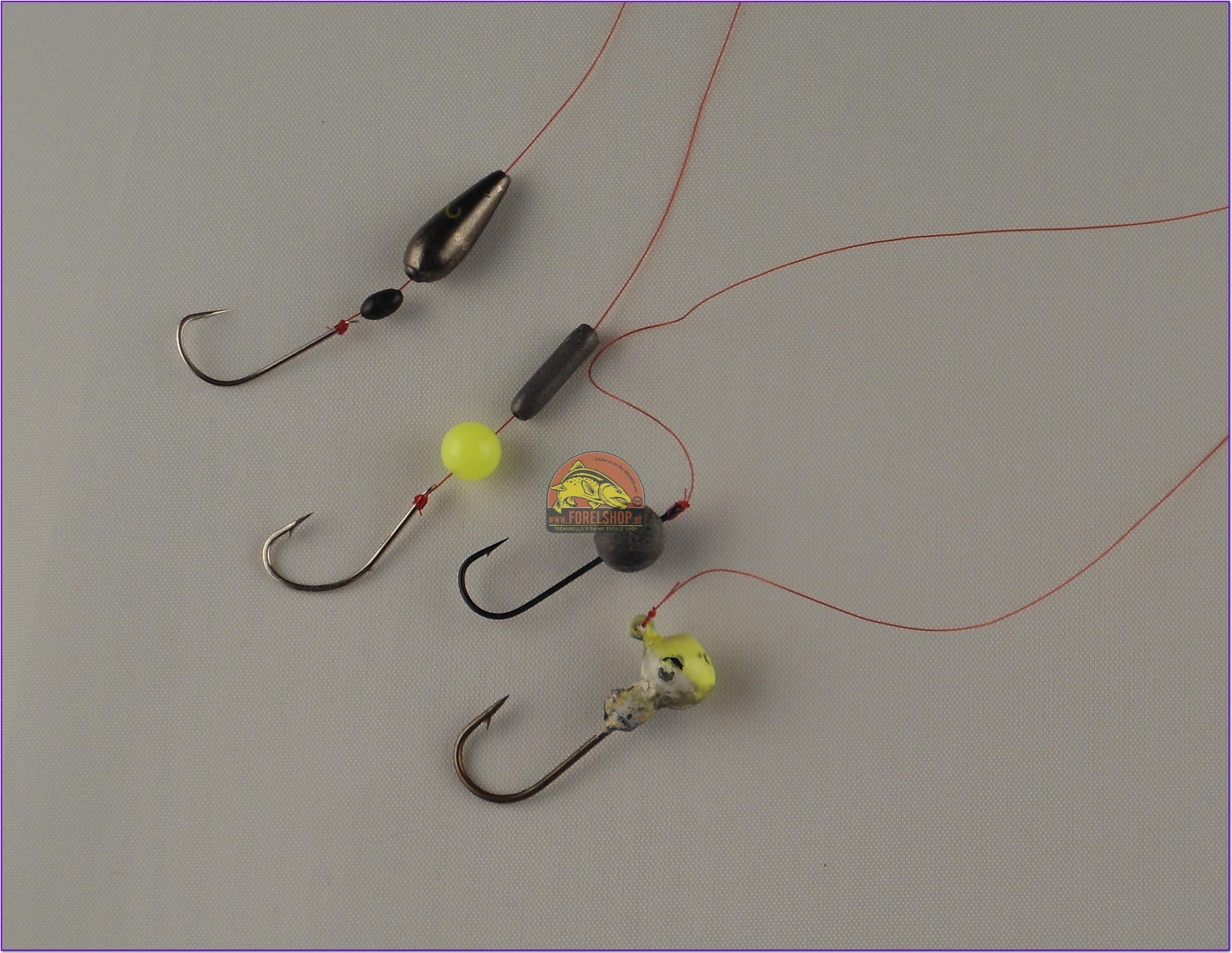 2.bijvoorbeeld een berkley cherrywood hd 2.7mtr en aan einde van hoofdlijn een schuiflood ca. 2 gram, gevolgd door gummistopper met een 3-tons wartel. Dan een onderlijn, ca. 80cm, met minimale haakgrootte van 4 met lange steel. Neem de mice tail en schuif haak recht door kopje en laat het even verder door staart er weer uit komen!