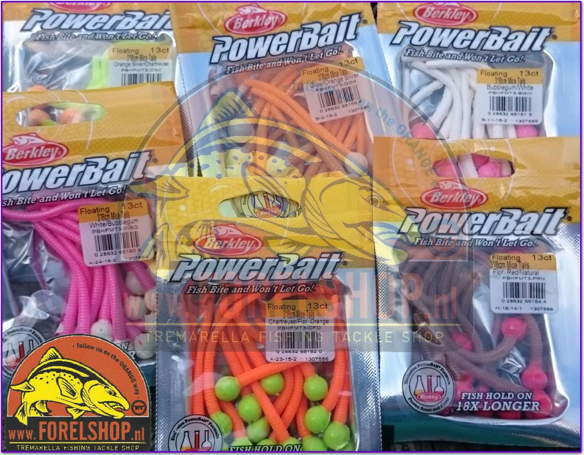 Twee klassieke forel vormen, de zalm ei en de forellen worm, werden gecombineerd om deze spannende Berkley Powerbait drijvende Mice tails te creëren. Elke drijvende mice tail is doordrenkt met Berkley's prikkelende Powerbait geur. Verschillende kop- en staartkleuren vormen een contrast in het water.